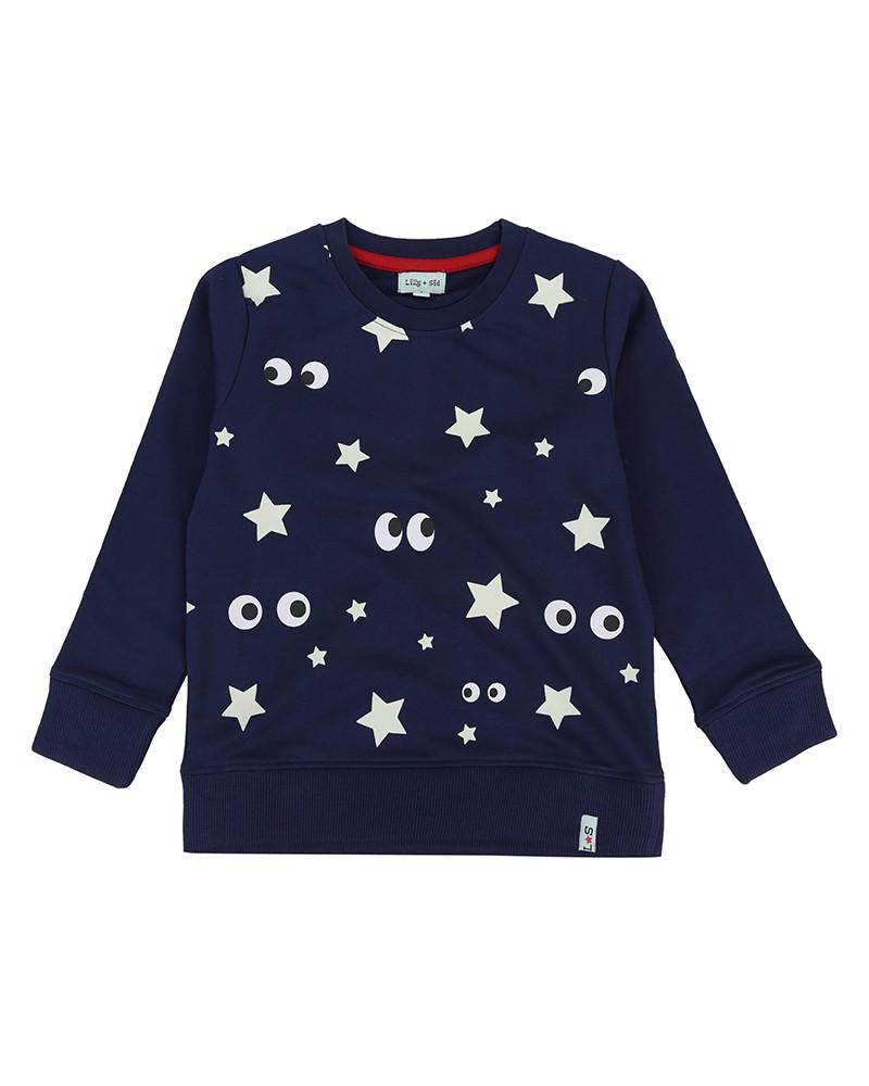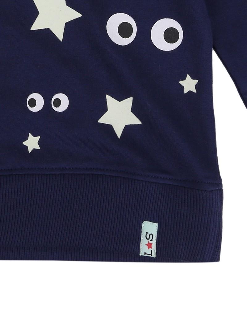 What can you see in the dark ?! Little ones will love this star print top, turn off the lights to see the stars glow. Made from our stripe jersey fabric with mock navy sleeves, this is a fun piece for 2-8 years.
