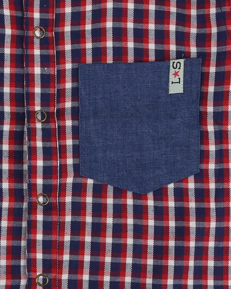 In our own design woven check, this shirt is great for parties and playdates this season. Contrast pocket and soft jersey cuffs. Popper front fastening for easy peasy dressing- no buttons means more time to play !