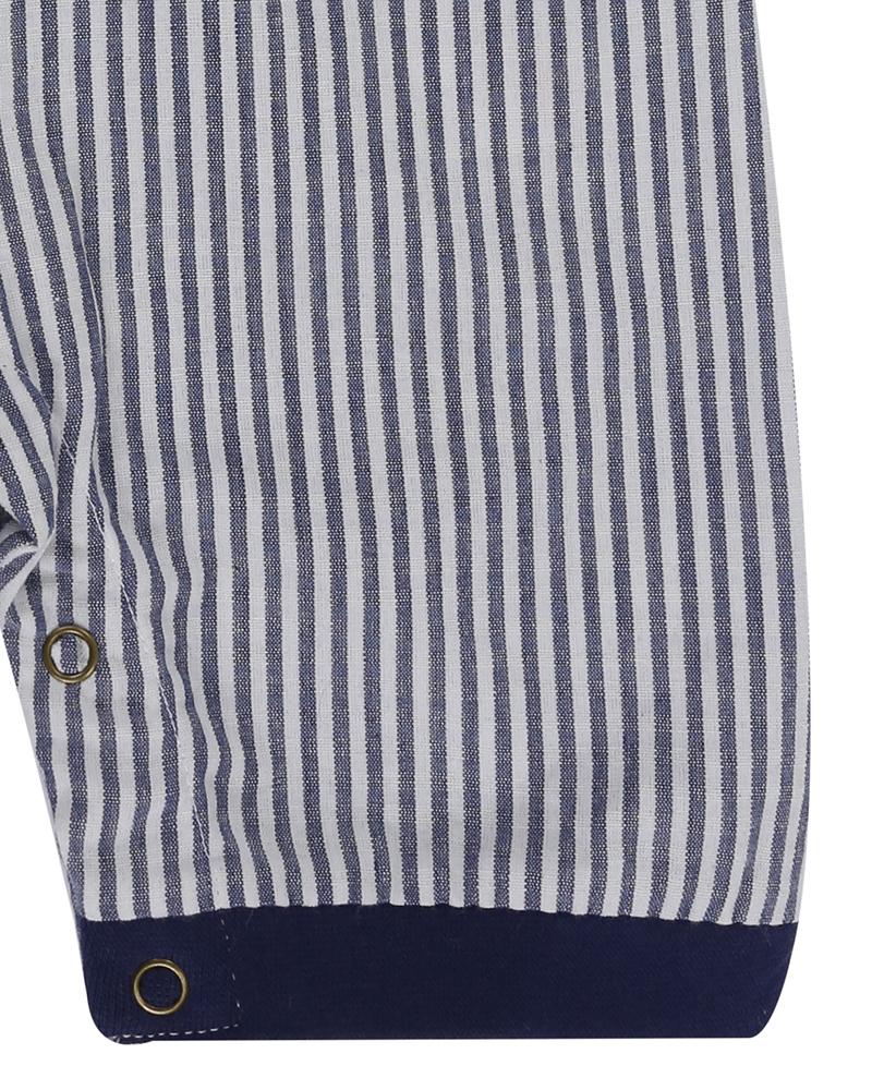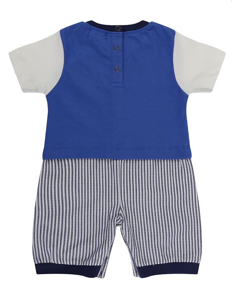 One of our best sellers, this looks like a short and t-shirt set, but is a super easy all-in-one style. Top section is made from soft cotton jersey, with woven stripe shorts section. Embroidered cars motif completes the look. Poppers to legs and neck for easy dressing