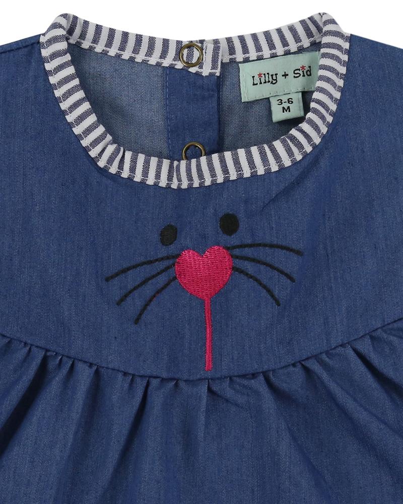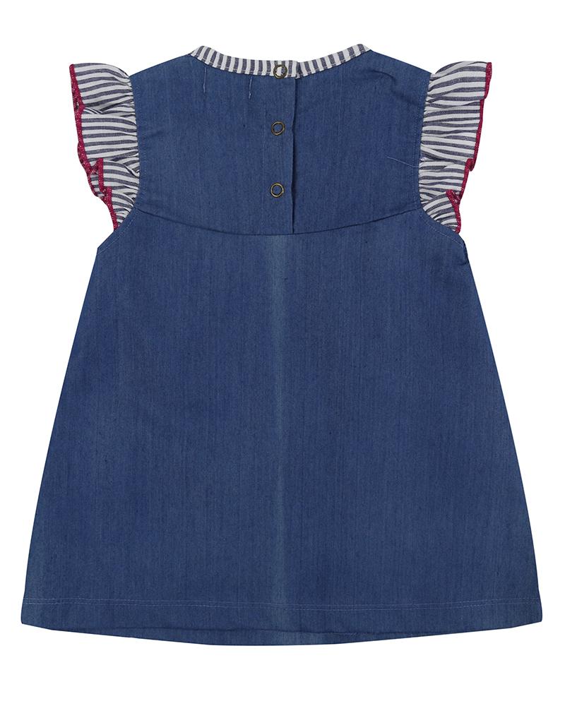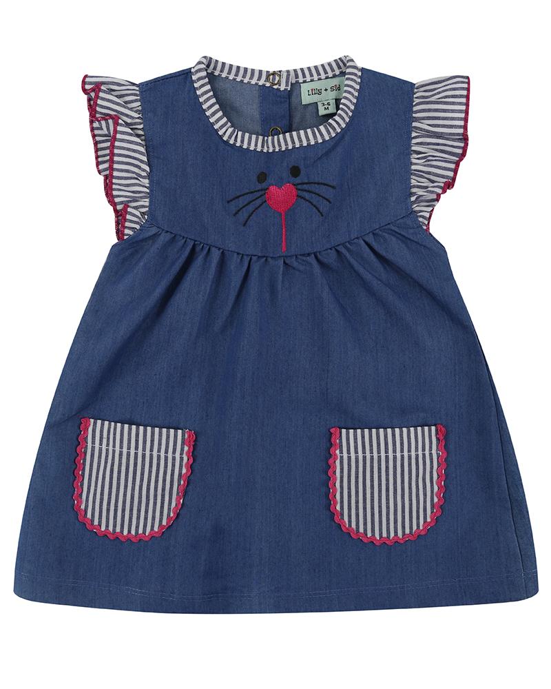 New for 2019, this character piece brings the fun of dress-up into every day wear. Made from soft denim chambray fabric, the dress has contrast stripe pocket and sleeve frill. Ric rac trim and embroidery complete the look. Popper back fastening.