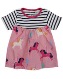 Jersey stripe top section and woven Carousel print main body make this dress a cute, comfortable option for baby girls this season. Great for sunny days, this dress looks lovely layered up over leggings too . Popper back neck fastening.