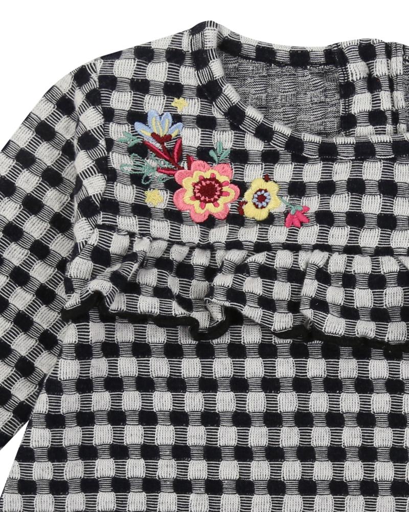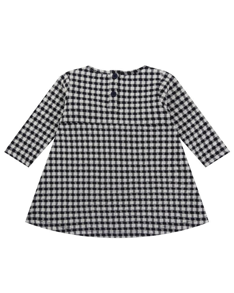 New for 2019, our jersey check fabric is a lovely winter weight jacquard. In classic navy, the dress has insert frill detailing and pretty floral embroidery to bodice. For parties and playdates, wear back with our fun tights for top to toe outfitting. Button back fastening.