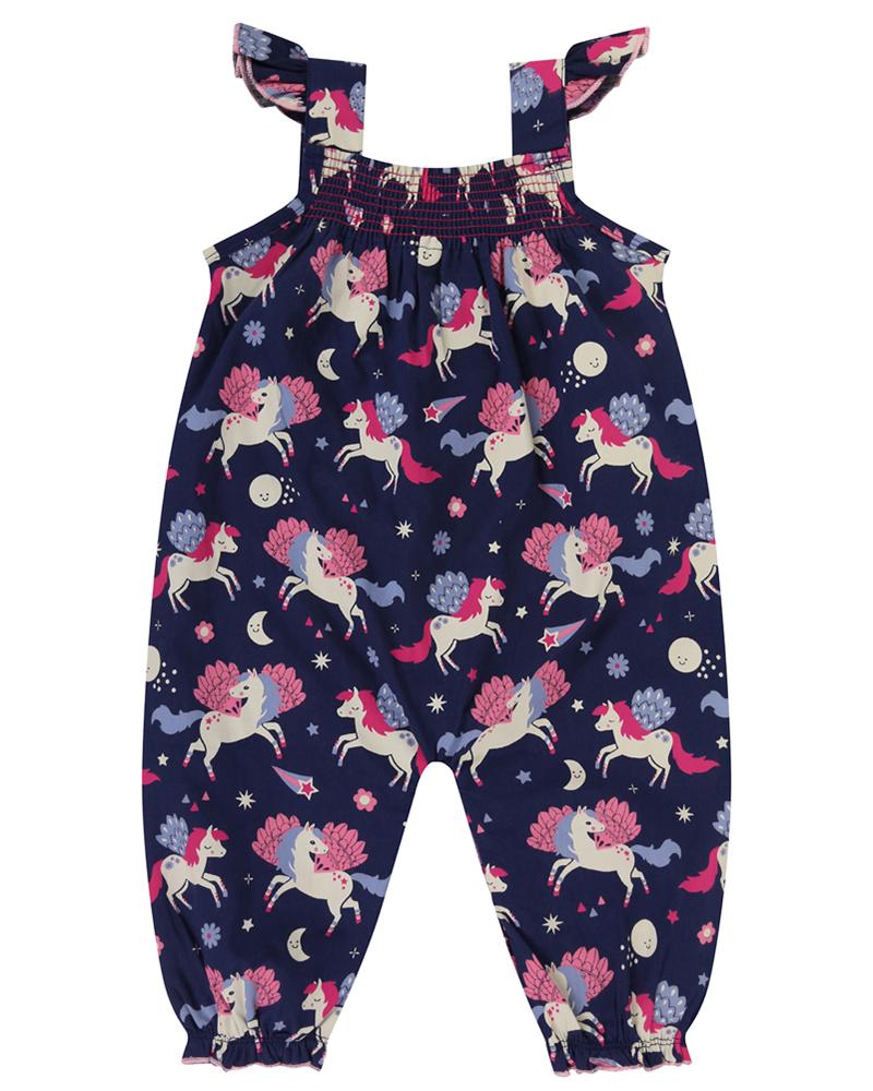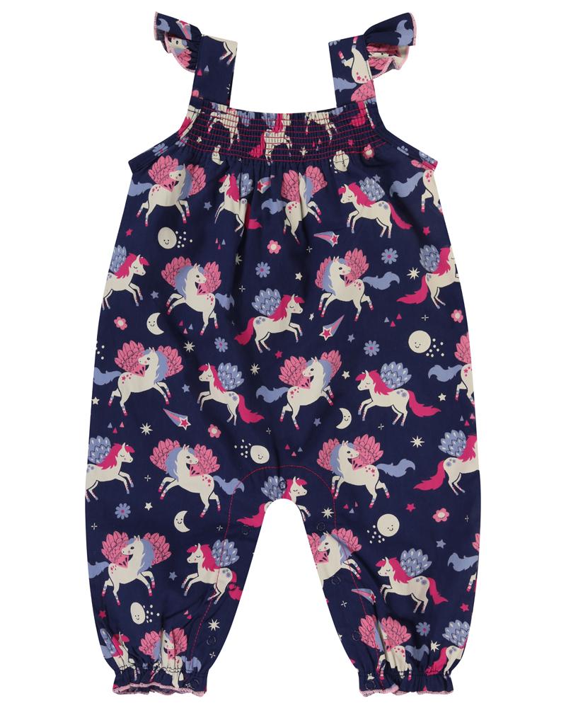 Back by popular demand, these dungarees are made from lightweight woven cotton fabric in Pegasus print. Soft smocking to chest and elastication to legs for a comfort finish, wear alone in sunny days or with our layering tops when the weather cools. Popper fastening to legs for easy dressing.