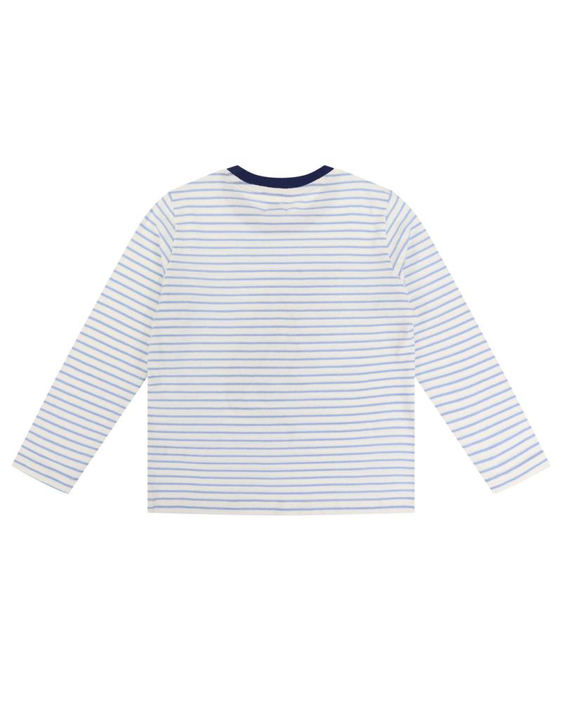 Roaring dino features as an applique on this stripe top . Made from our premium cotton fabric, the classic blues stripe looks great worn back with any of our bottoms this season.