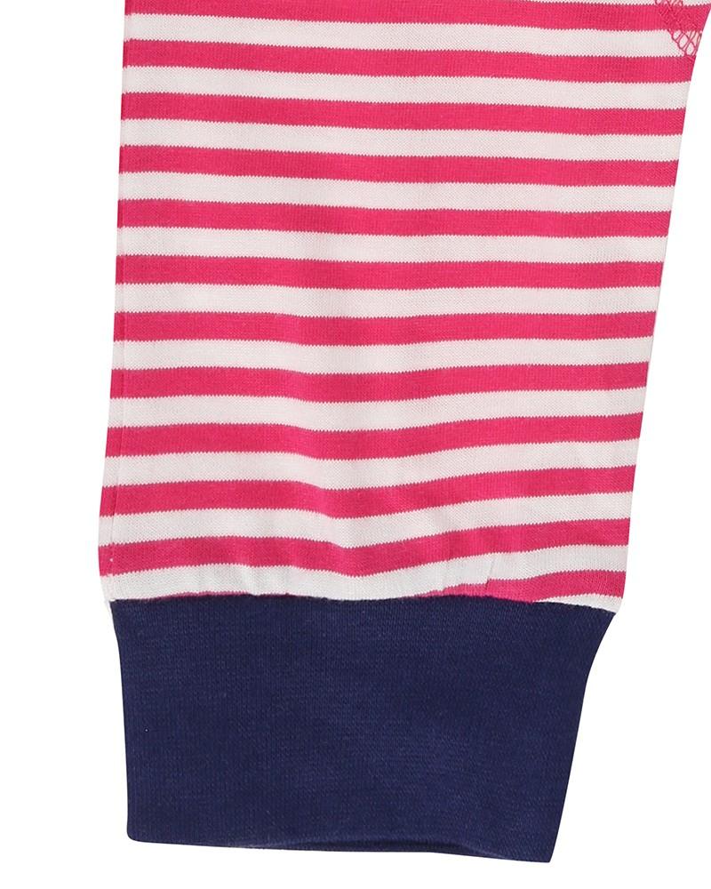 Our new print features woodland animals and flowers on soft cotton jersey. The tunic has inserted frill and soft gathers for a pretty fullness. Co-ordinating pink stripe leggings complete the look .