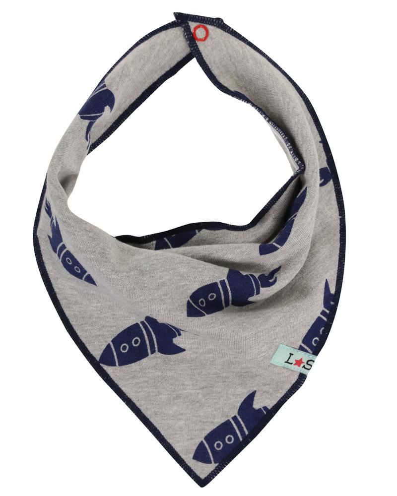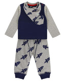 One of our best selling lines, this 3 piece set is designed for versatile style this season. The joggers are made from lightweight sweatshirt fabric with rocket print, perfect for little crawlers. Navy jersey top with stripe sleeves has a popper neck fastening, reversible bib completes the look. This set would make a lovely new baby gift.