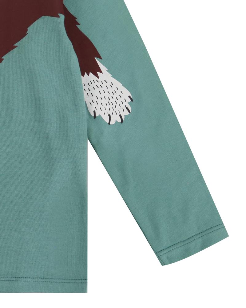 Can’t beat a hug, especially a bear hug ! Little ones will love this roarsome character printed on soft cotton jersey fabric in on-trend sage green . Wear back with joggers, trousers and jeans for a fun outfit choice.
