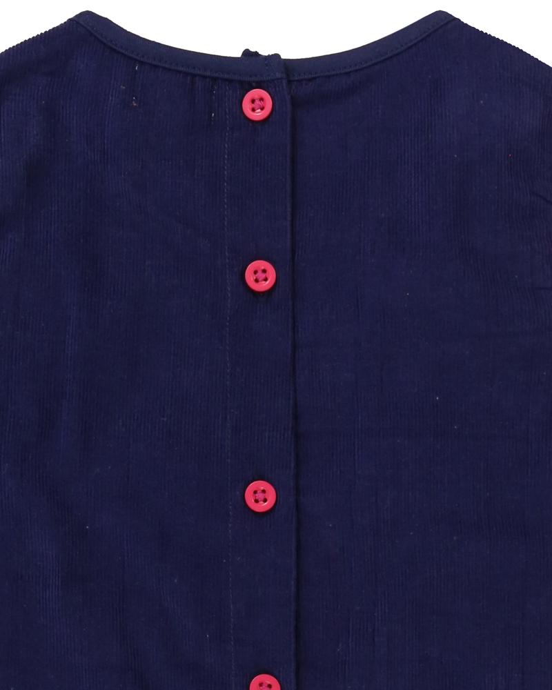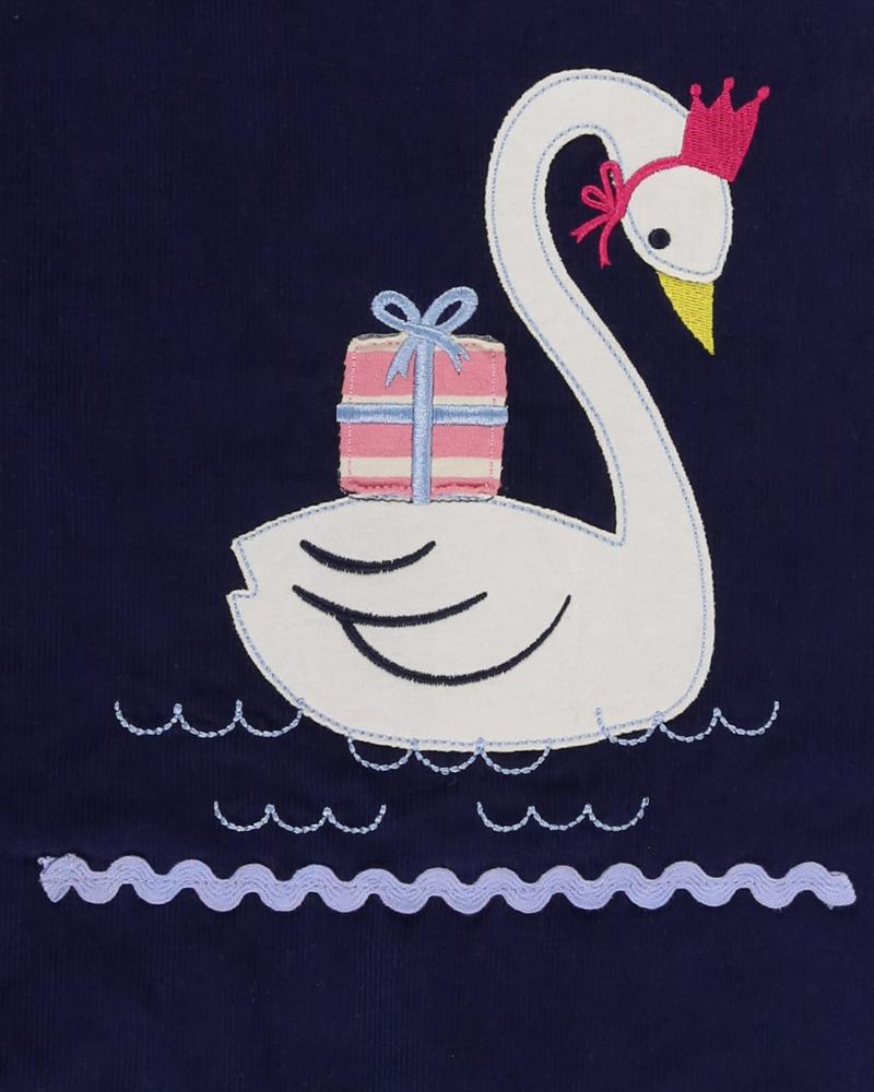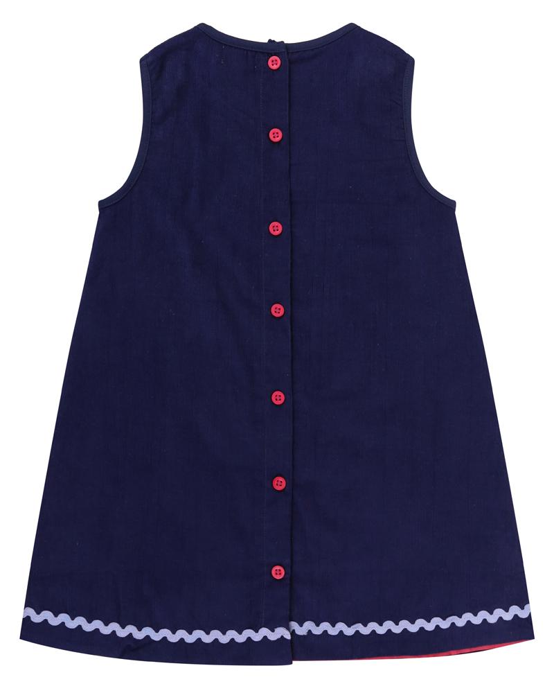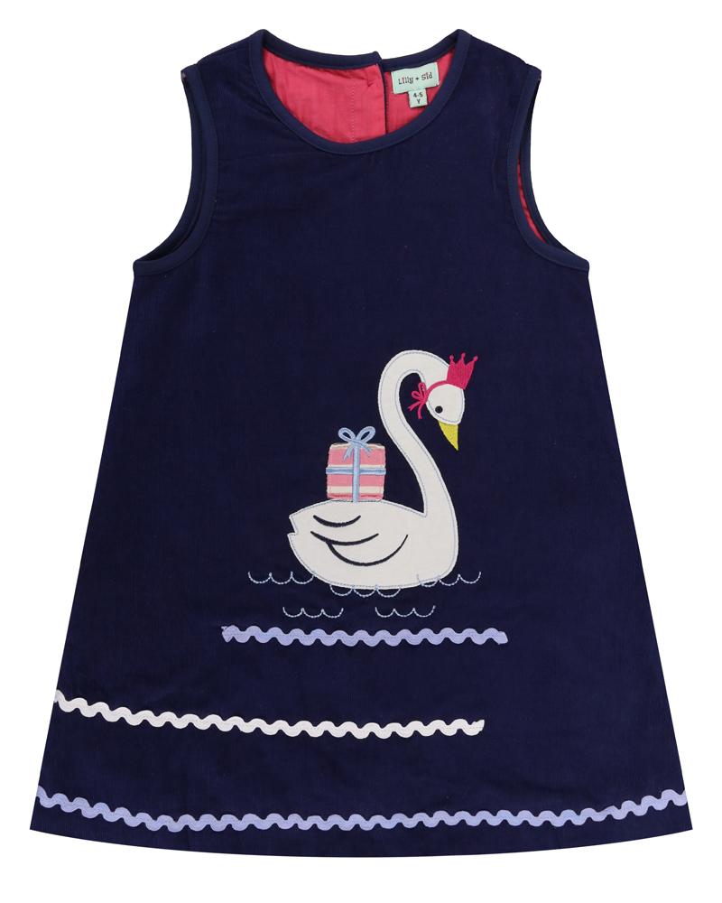 With soft A-line shaping, this dress is a versatile piece for seasonal dressing. Made from our navy woven cord fabric, the contrast pink lining and button back fastening bring a pop of colour which co-ordinates with the fun swan applique and ric-rac trim.