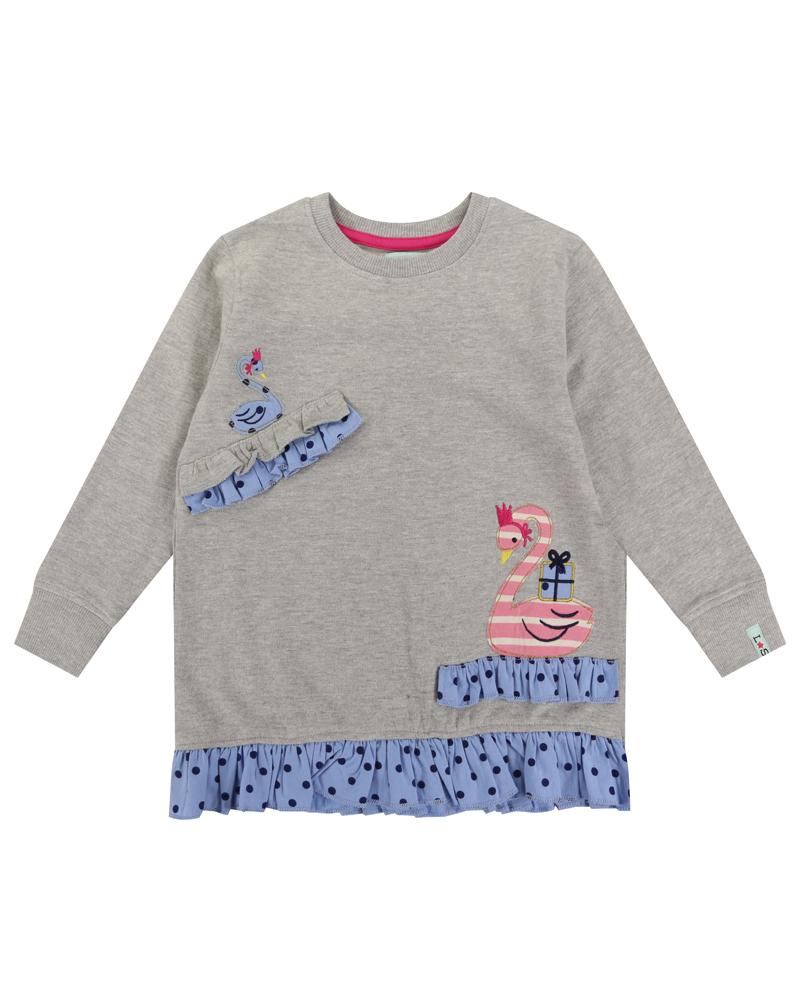 Our applique sweatshirts are made from a lightweight sweatshirt fabric- great for layering up on cooler days. This soft grey option has a dotty frills with character details which little ones will love. Longer length fit, this looks great with our leggings for a unique outfit choice.