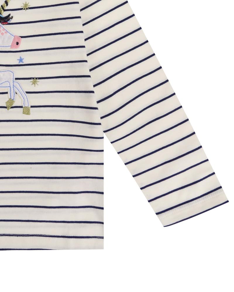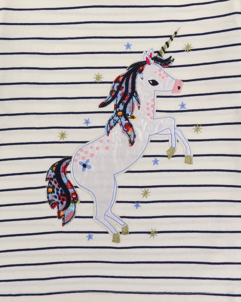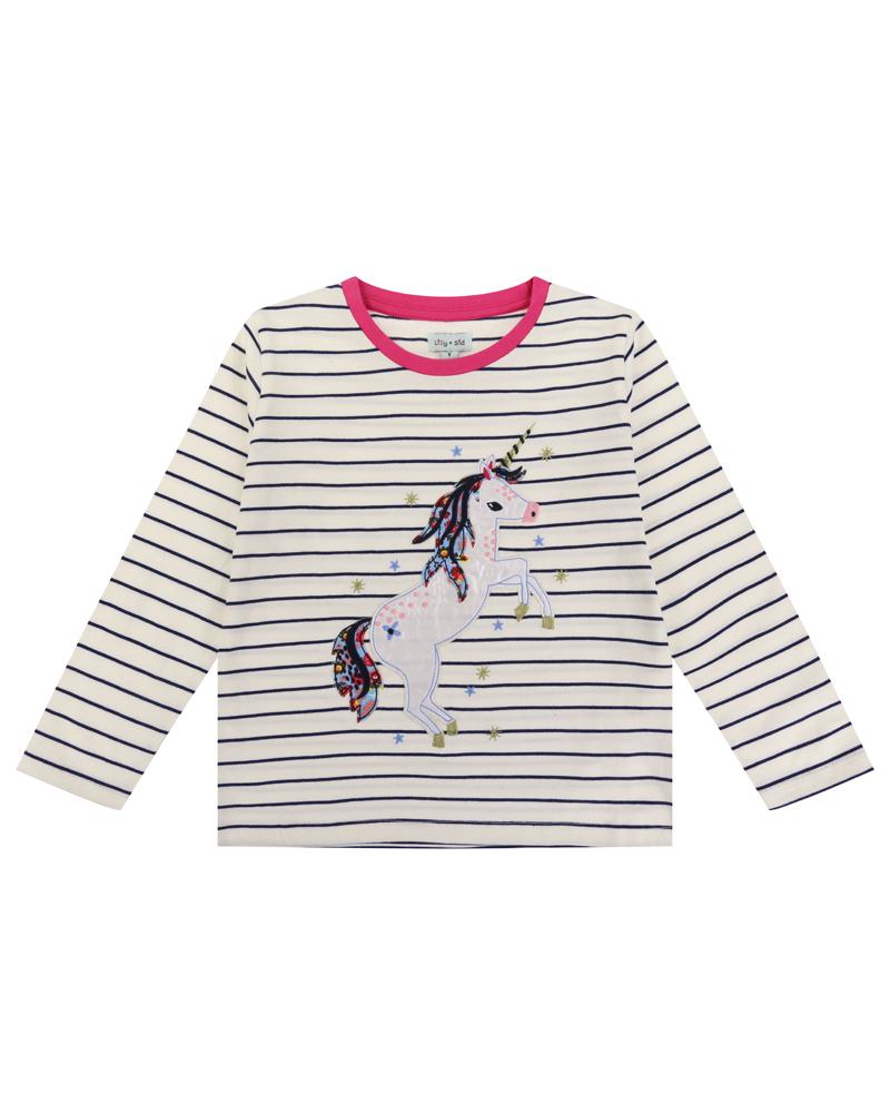 This unicorn applique top with satin details will delight any little lady this season. The 100% cotton jersey design in classic navy will co-ordinate back with any skirt in the L+S collection for top to toe outfitting.